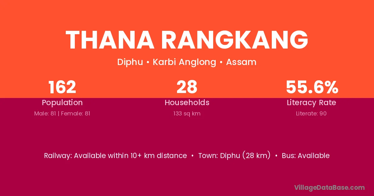 Diphu (28 km) is the nearest town to Thana Rangkang village for major economic activities and is located approximately 28 km away.