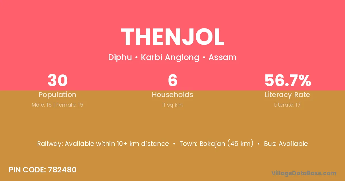 Bokajan (45 km) is the nearest town to Thenjol village for major economic activities and is located approximately 45 km away.