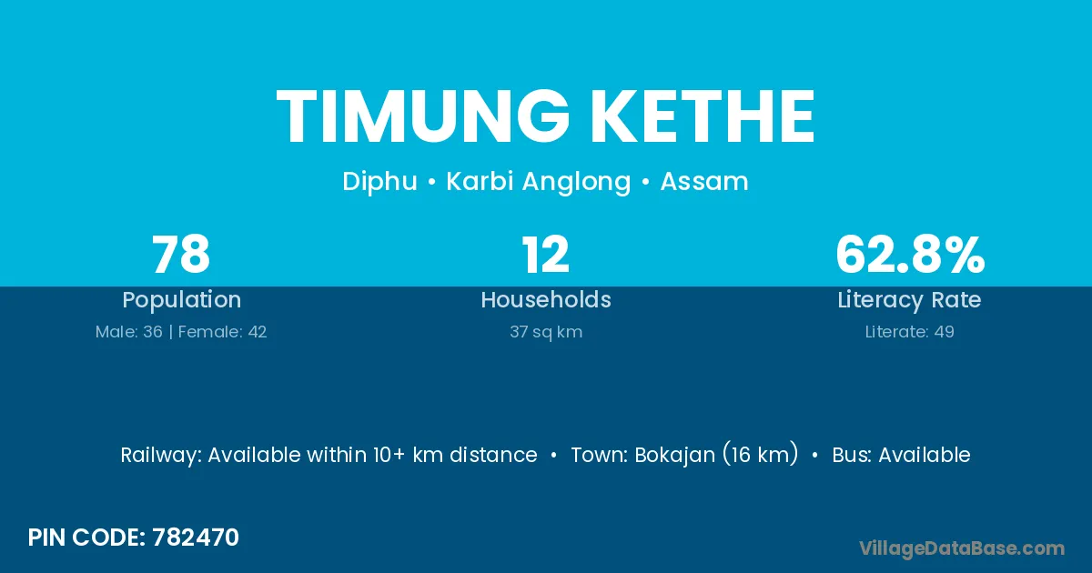 Bokajan (16 km) is the nearest town to Timung Kethe village for major economic activities and is located approximately 16 km away.