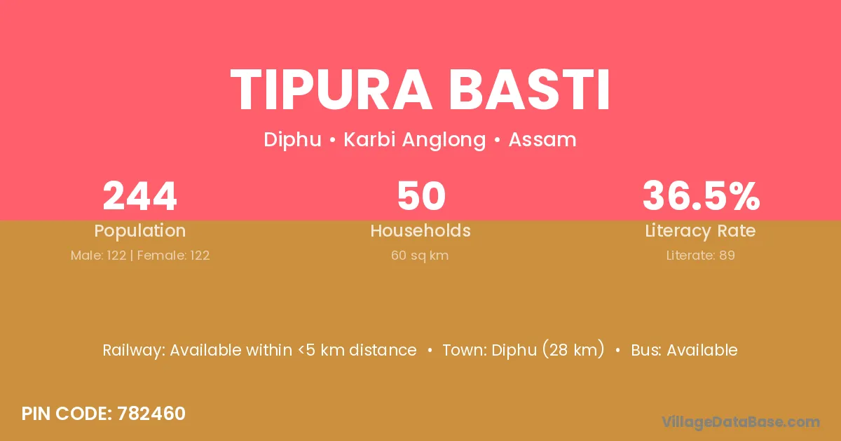 Diphu (28 km) is the nearest town to Tipura Basti village for major economic activities and is located approximately 28 km away.