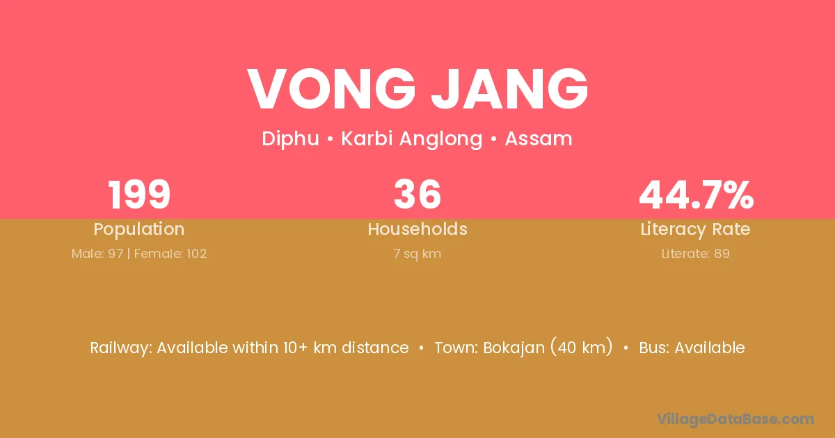 Bokajan (40 km) is the nearest town to Vong Jang village for major economic activities and is located approximately 40 km away.