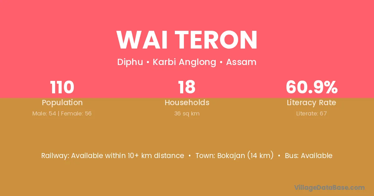 Bokajan (14 km) is the nearest town to Wai Teron village for major economic activities and is located approximately 14 km away.