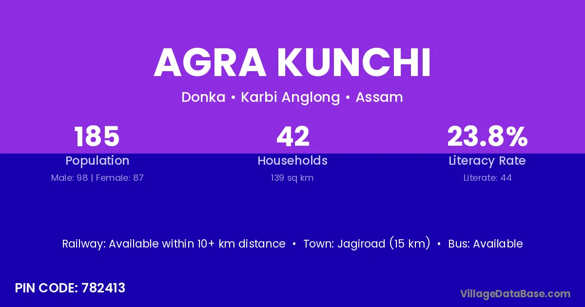 Jagiroad (15 km) is the nearest town to Agra Kunchi village for major economic activities and is located approximately 15 km away.