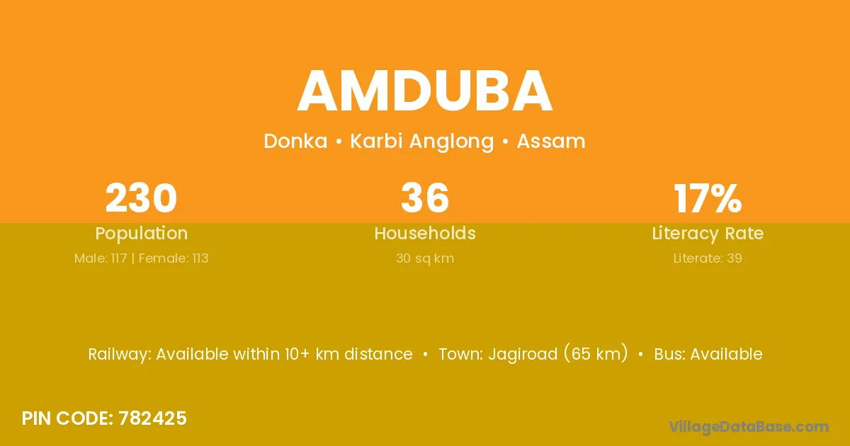 Jagiroad (65 km) is the nearest town to Amduba village for major economic activities and is located approximately 65 km away.