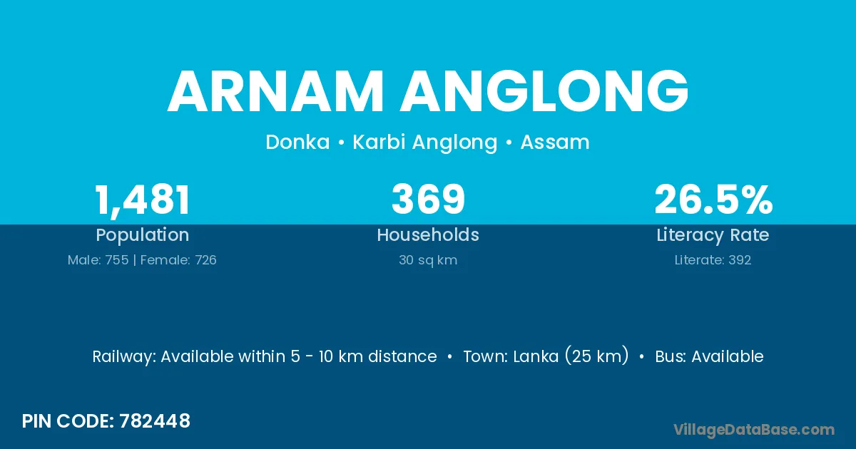 Lanka (25 km) is the nearest town to Arnam Anglong village for major economic activities and is located approximately 25 km away.