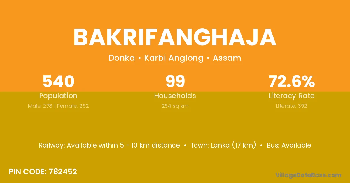 Lanka (17 km) is the nearest town to Bakrifanghaja village for major economic activities and is located approximately 17 km away.