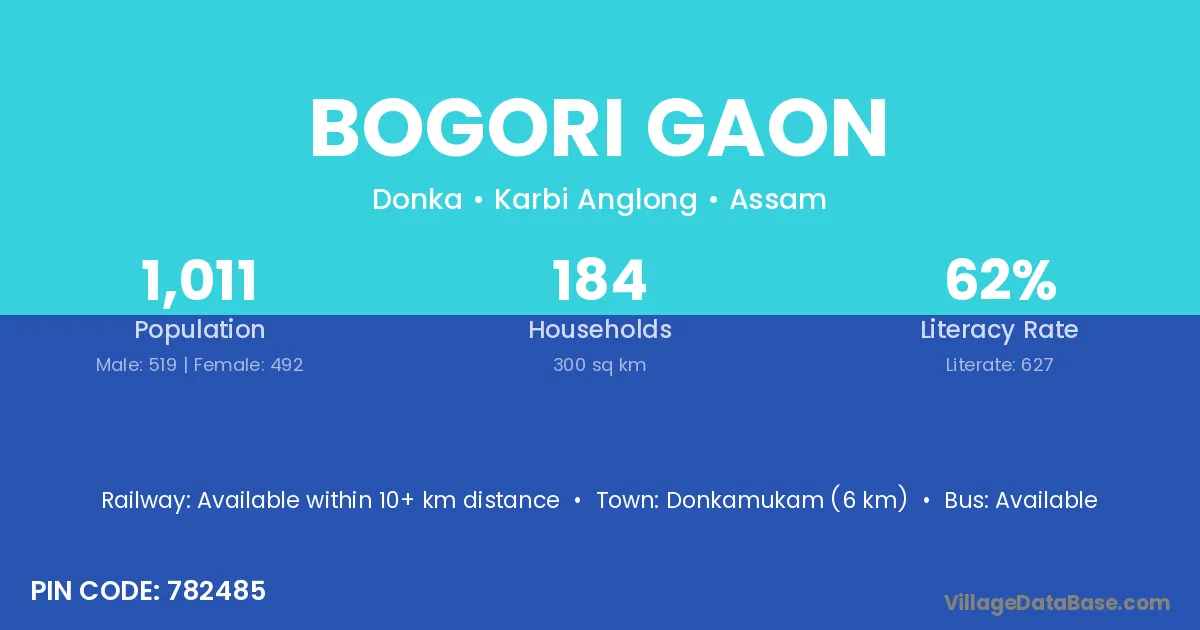Donkamukam (6 km) is the nearest town to Bogori Gaon village for major economic activities and is located approximately 6 km away.