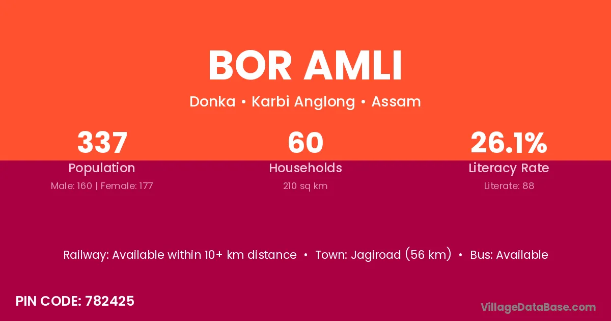 Jagiroad (56 km) is the nearest town to Bor Amli village for major economic activities and is located approximately 56 km away.