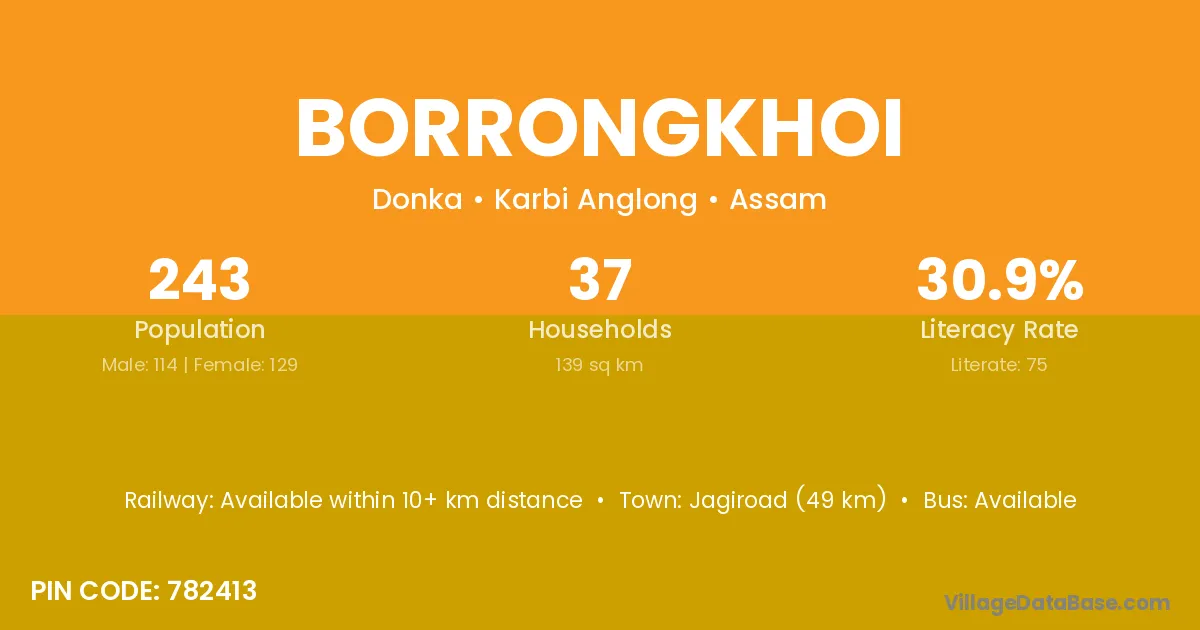 Jagiroad (49 km) is the nearest town to Borrongkhoi village for major economic activities and is located approximately 49 km away.