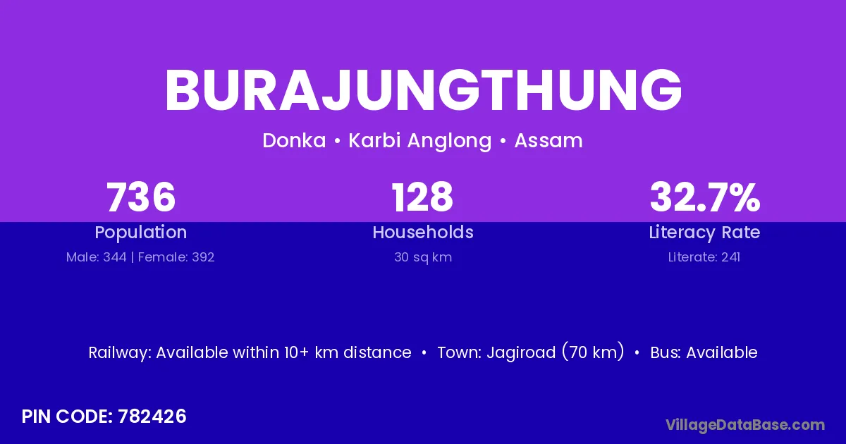 Jagiroad (70 km) is the nearest town to Burajungthung village for major economic activities and is located approximately 70 km away.