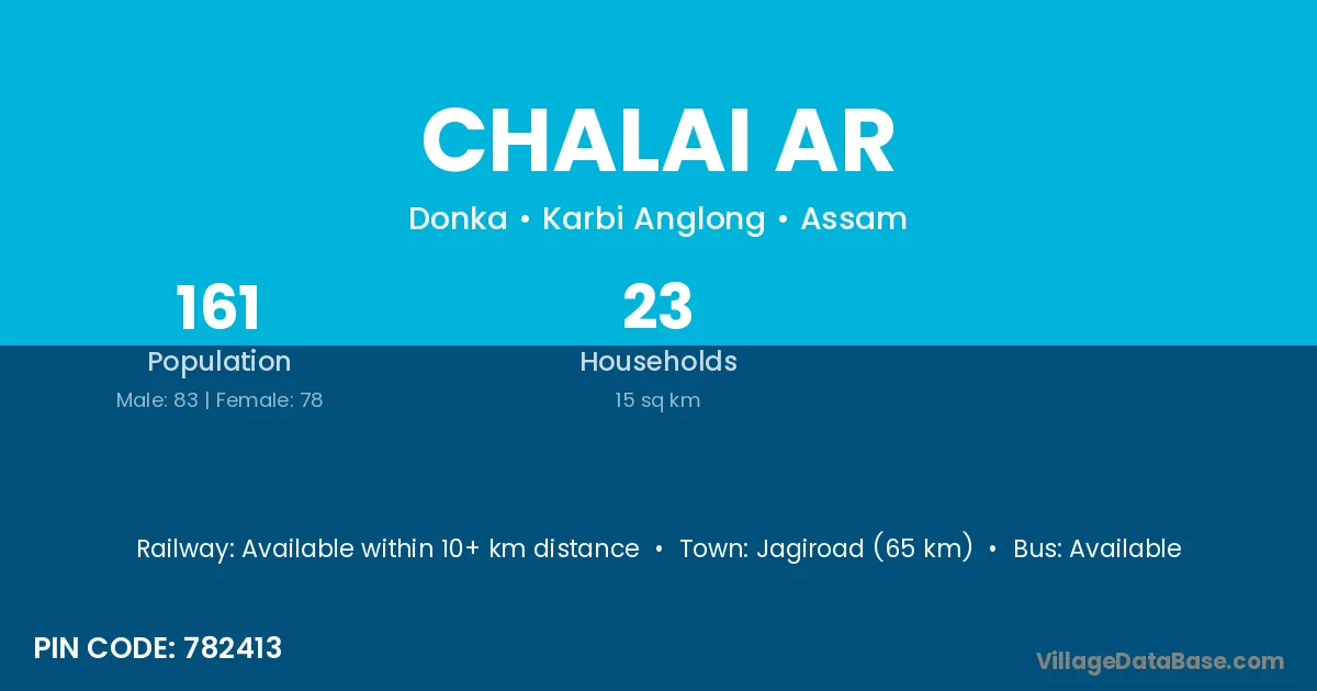 Jagiroad (65 km) is the nearest town to Chalai Ar village for major economic activities and is located approximately 65 km away.