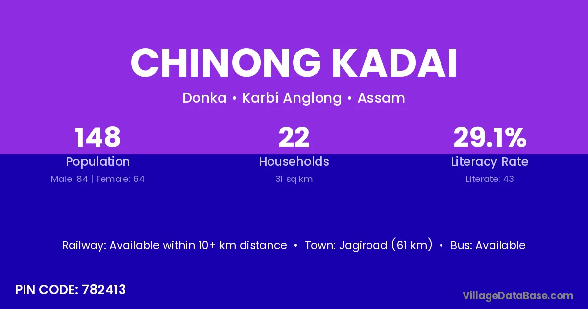 Jagiroad (61 km) is the nearest town to Chinong Kadai village for major economic activities and is located approximately 61 km away.