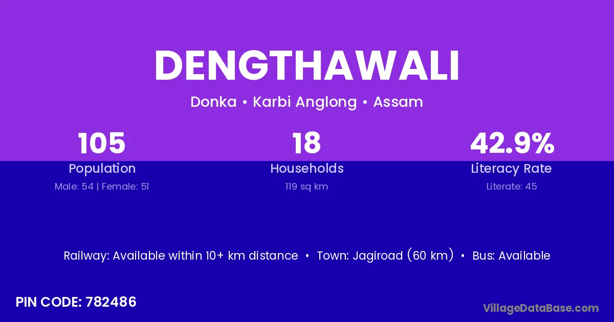 Jagiroad (60 km) is the nearest town to Dengthawali village for major economic activities and is located approximately 60 km away.