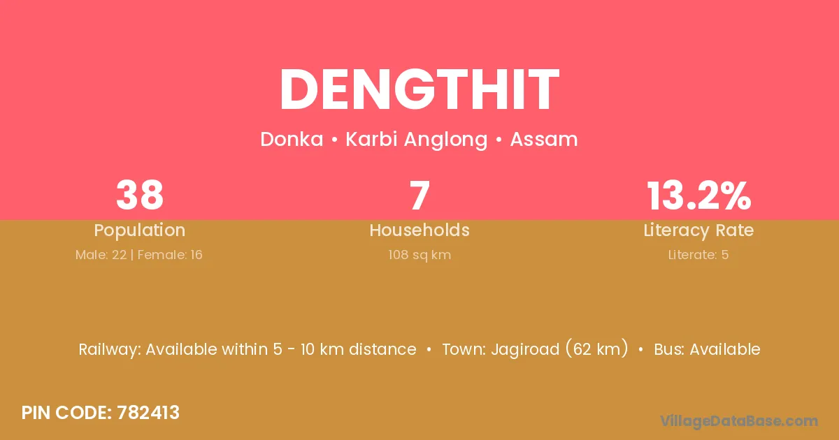 Jagiroad (62 km) is the nearest town to Dengthit village for major economic activities and is located approximately 62 km away.