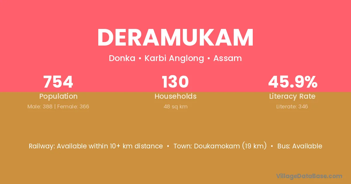 Deramukam village has a total population of 754 people, of which 388 are males and 366 are females.