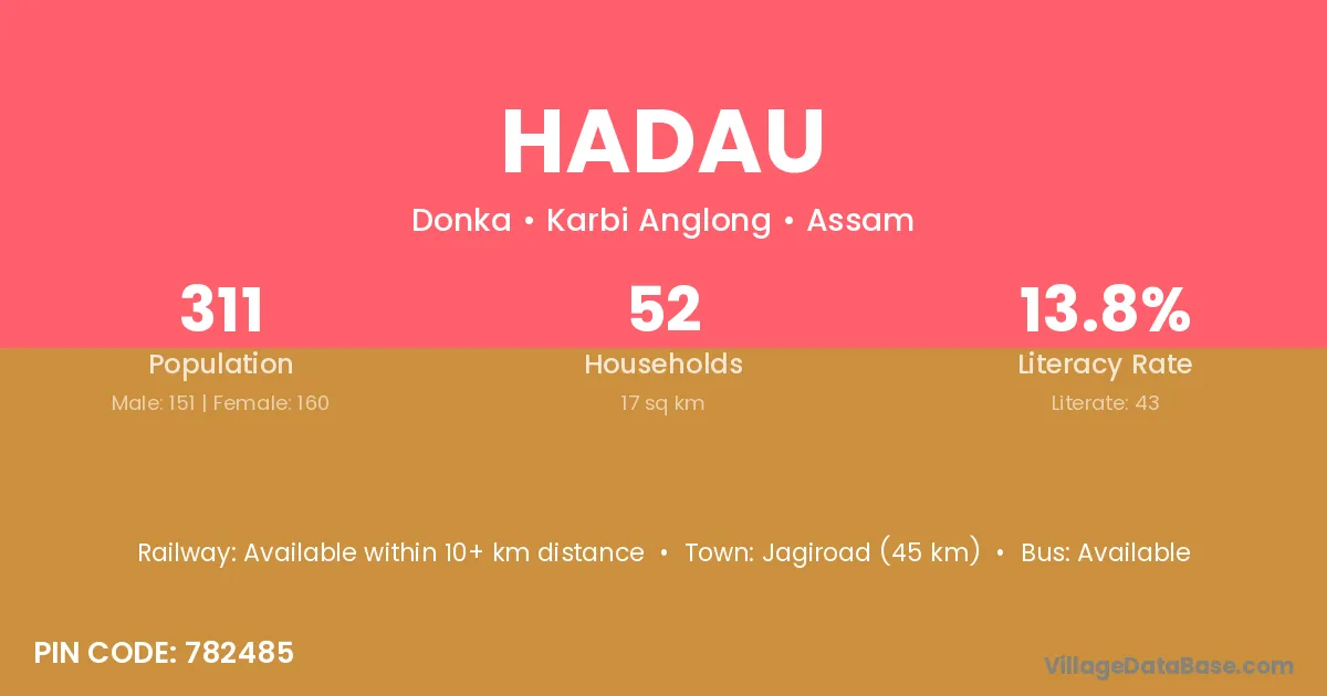 Jagiroad (45 km) is the nearest town to Hadau village for major economic activities and is located approximately 45 km away.