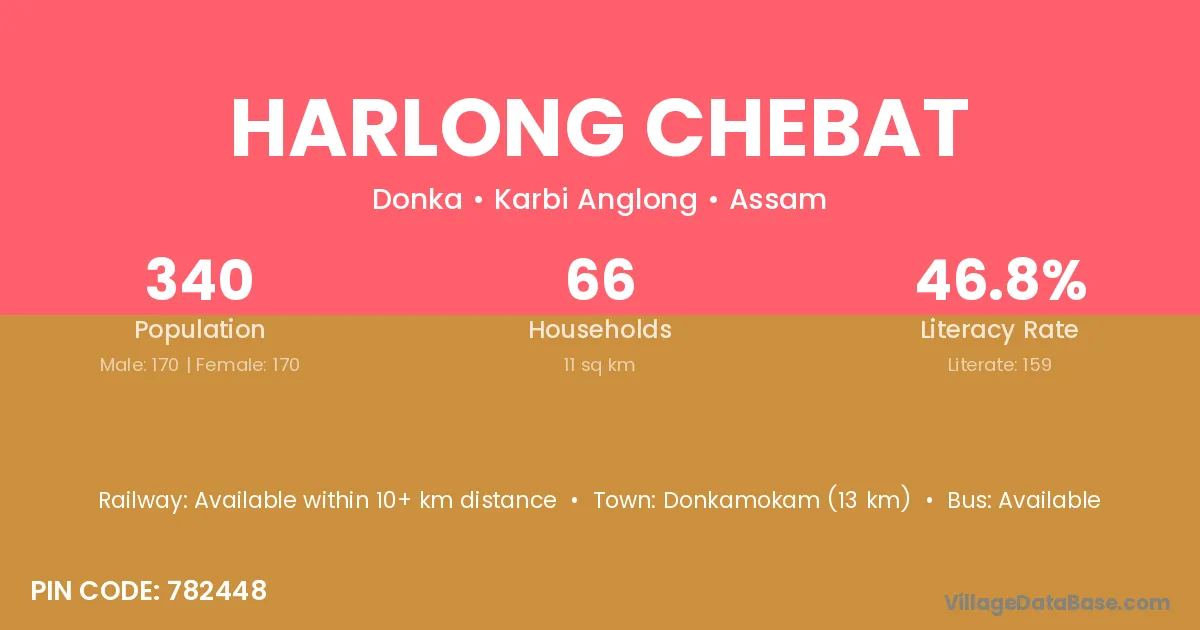 Donkamokam (13 km) is the nearest town to Harlong Chebat village for major economic activities and is located approximately 13 km away.