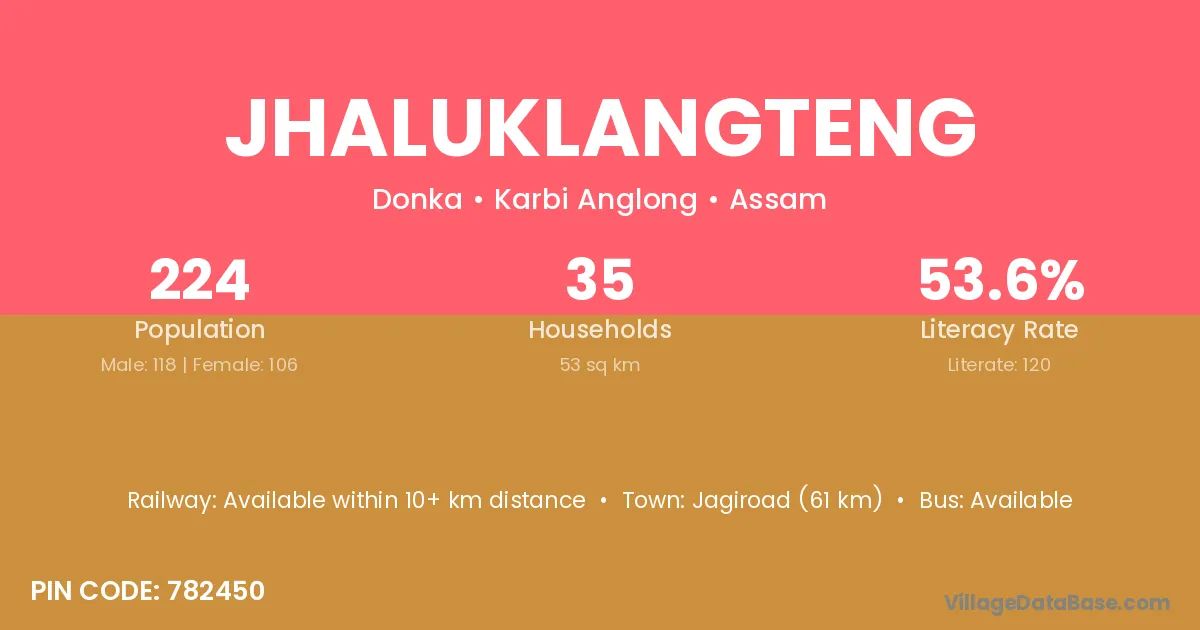 Jagiroad (61 km) is the nearest town to Jhaluklangteng village for major economic activities and is located approximately 61 km away.