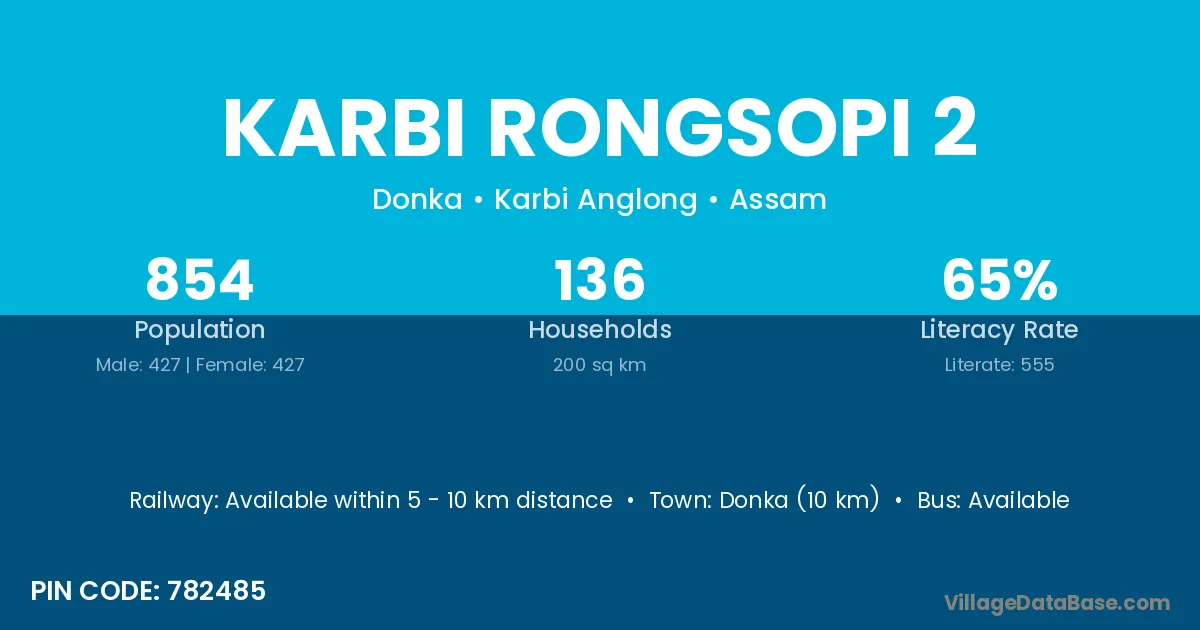 Karbi Rongsopi 2 village has a total population of 854 people, of which 427 are males and 427 are females.