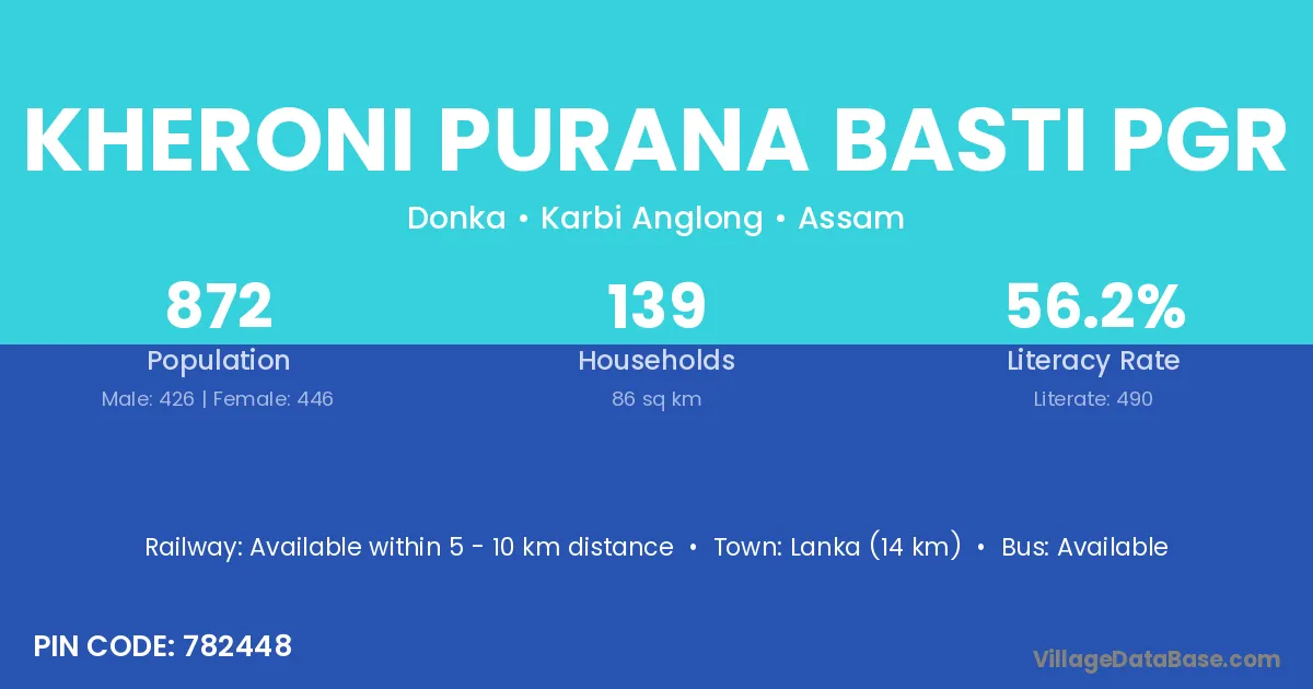 Kheroni Purana Basti Pgr village has a total population of 872 people, of which 426 are males and 446 are females.