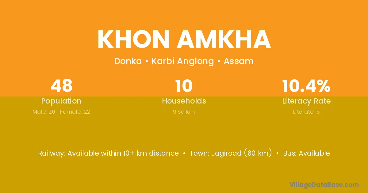 Jagiroad (60 km) is the nearest town to Khon Amkha village for major economic activities and is located approximately 60 km away.