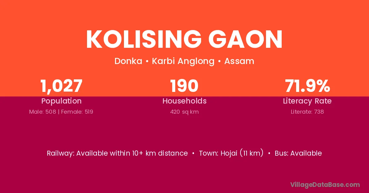 Hojai (11 km) is the nearest town to Kolising Gaon village for major economic activities and is located approximately 11 km away.