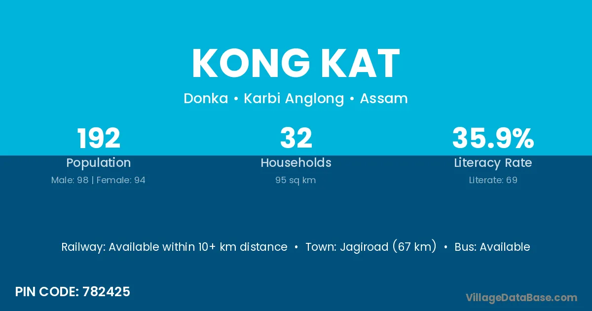Jagiroad (67 km) is the nearest town to Kong Kat village for major economic activities and is located approximately 67 km away.