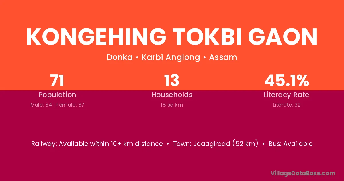 Kongehing Tokbi Gaon village has a total population of 71 people, of which 34 are males and 37 are females.