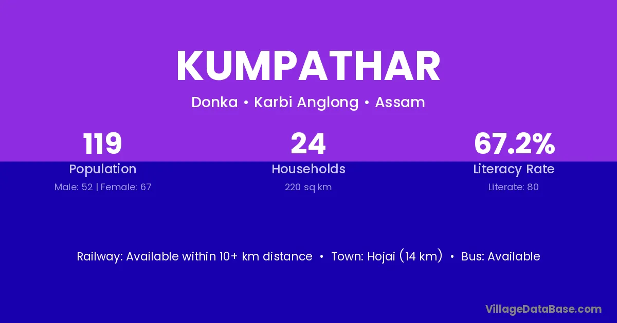 Hojai (14 km) is the nearest town to Kumpathar village for major economic activities and is located approximately 14 km away.