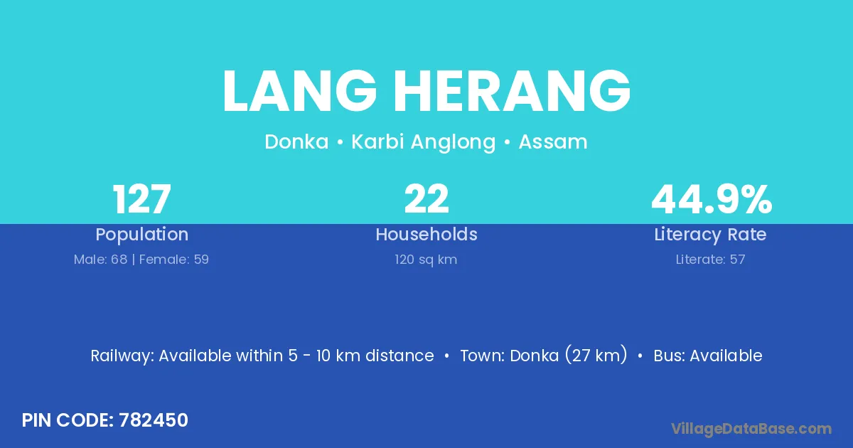 The literacy rate of Lang Herang village is 44.88%. Male literacy stands at 51.47% and female literacy at 37.29%.