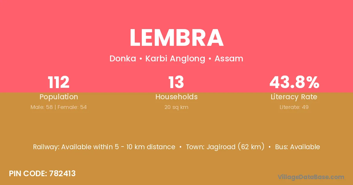 Jagiroad (62 km) is the nearest town to Lembra village for major economic activities and is located approximately 62 km away.