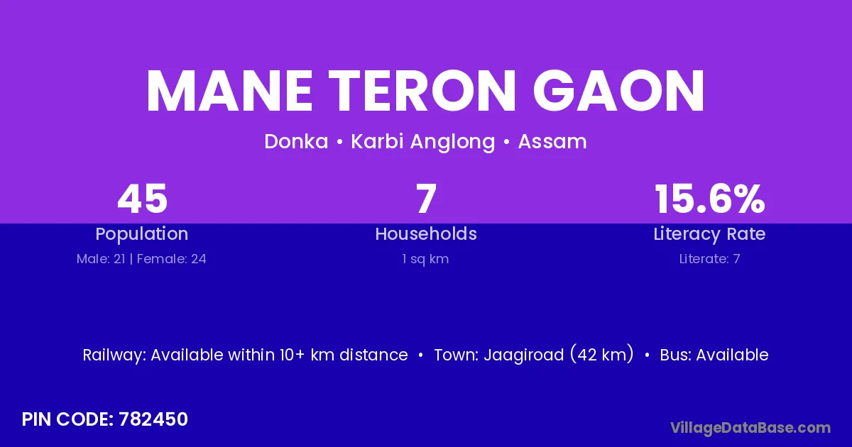 Mane Teron Gaon village has a total population of 45 people, of which 21 are males and 24 are females.