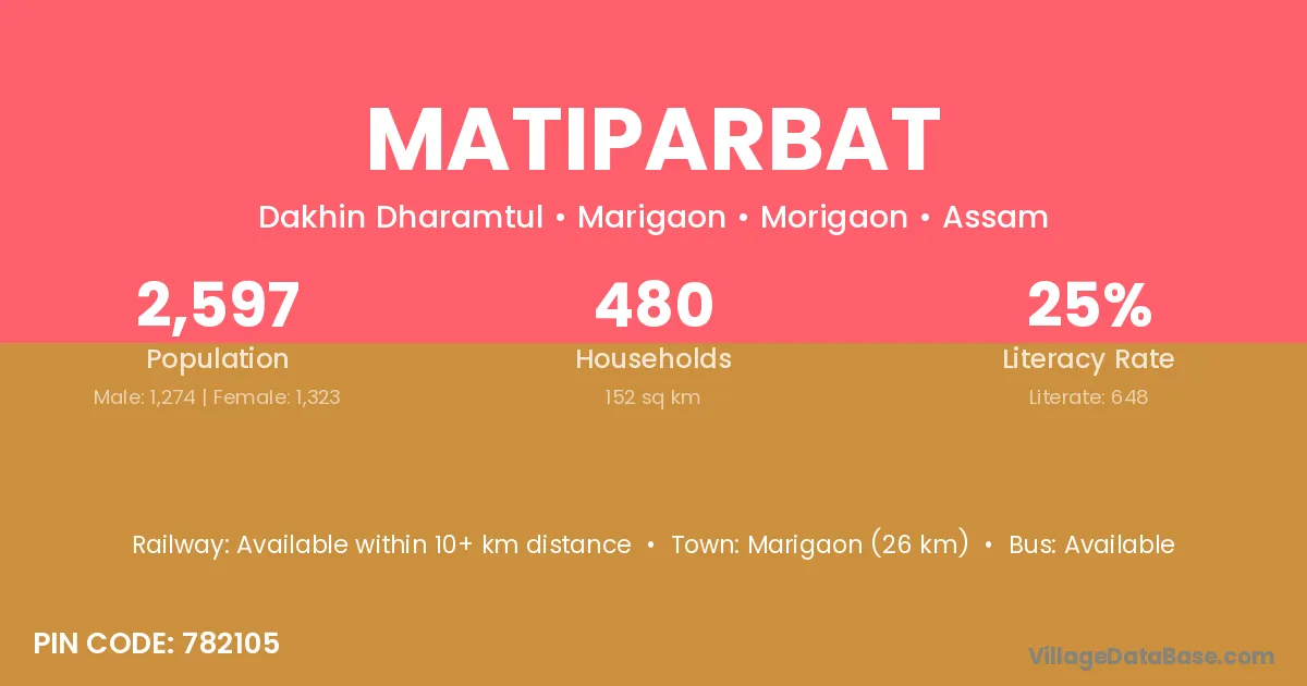 Donkamukam (5 km) is the nearest town to Matiparbat village for major economic activities and is located approximately 5 km away.