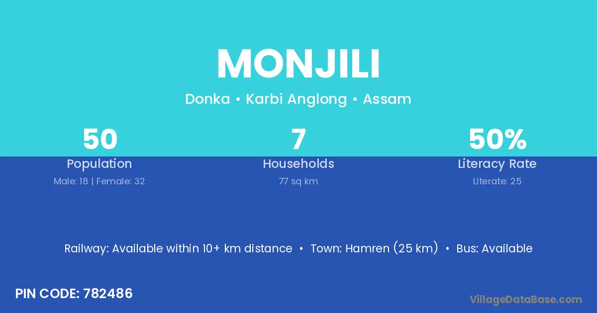 Hamren (25 km) is the nearest town to Monjili village for major economic activities and is located approximately 25 km away.