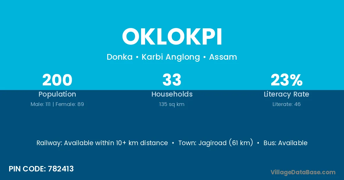 Jagiroad (61 km) is the nearest town to Oklokpi village for major economic activities and is located approximately 61 km away.