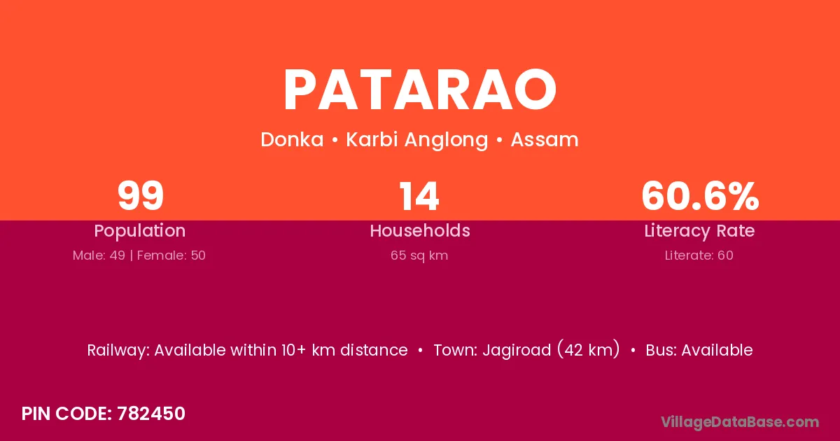 Jagiroad (42 km) is the nearest town to Patarao village for major economic activities and is located approximately 42 km away.