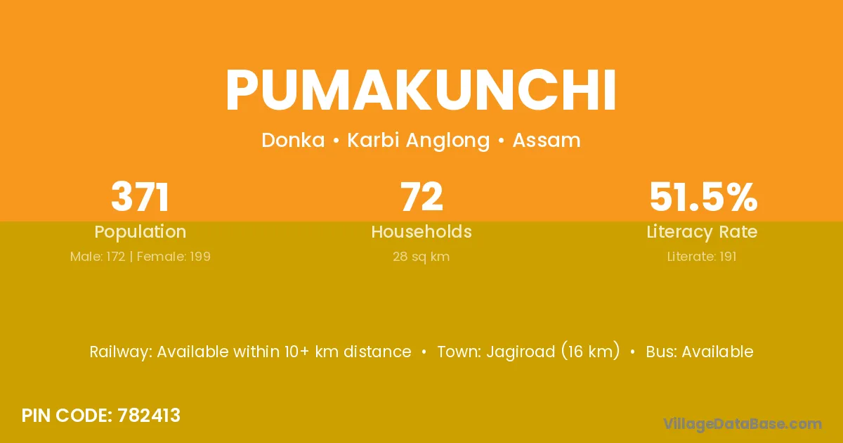 Jagiroad (16 km) is the nearest town to Pumakunchi village for major economic activities and is located approximately 16 km away.