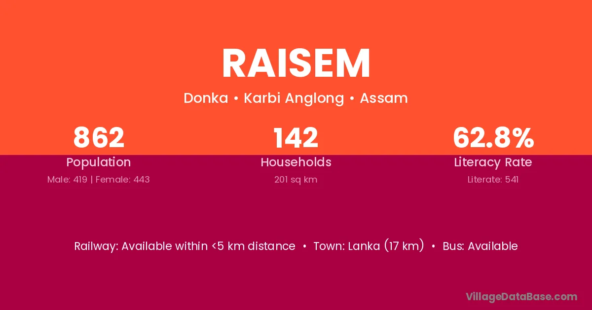 Lanka (17 km) is the nearest town to Raisem village for major economic activities and is located approximately 17 km away.