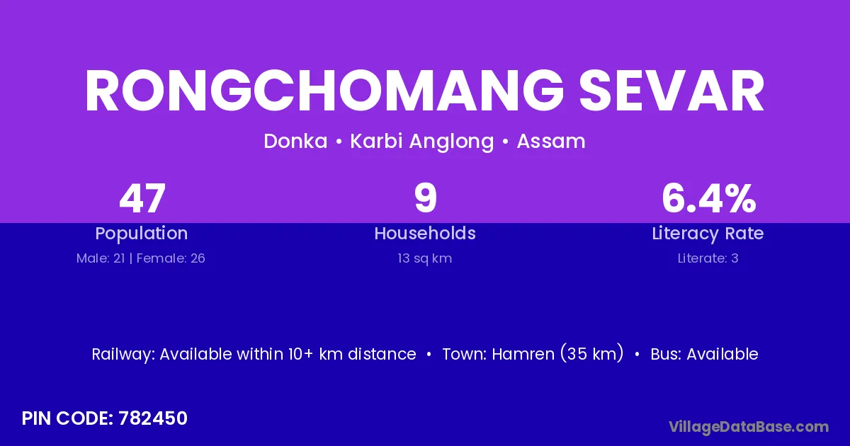 Hamren (35 km) is the nearest town to Rongchomang Sevar village for major economic activities and is located approximately 35 km away.