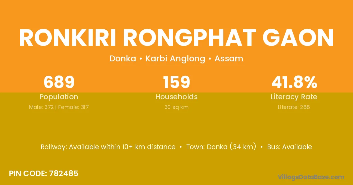 Donka (34 km) is the nearest town to Ronkiri Rongphat Gaon village for major economic activities and is located approximately 34 km away.