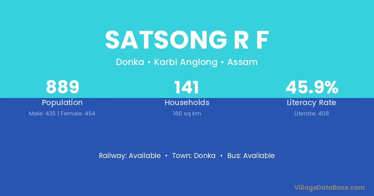 Satsong R F village has a total population of 889 people, of which 435 are males and 454 are females.