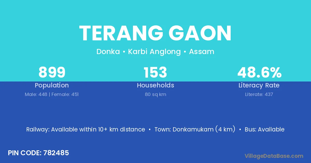 Terang Gaon village has a total population of 899 people, of which 448 are males and 451 are females.
