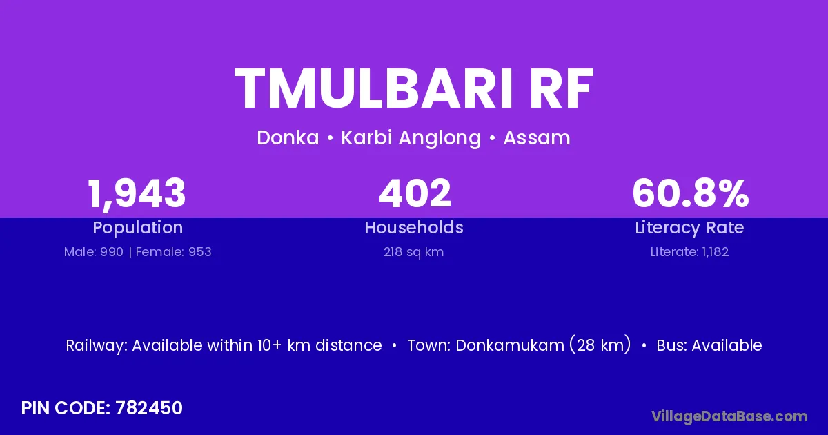 Tmulbari Rf village has a total population of 1,943 people, of which 990 are males and 953 are females.