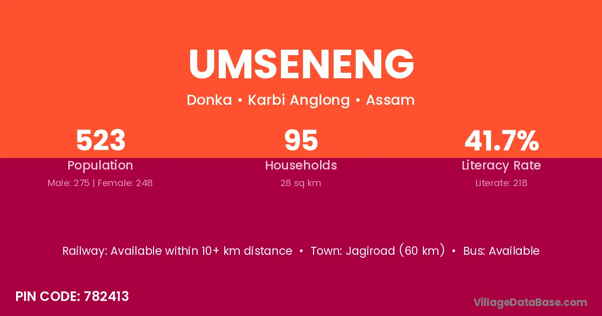 Jagiroad (60 km) is the nearest town to Umseneng village for major economic activities and is located approximately 60 km away.