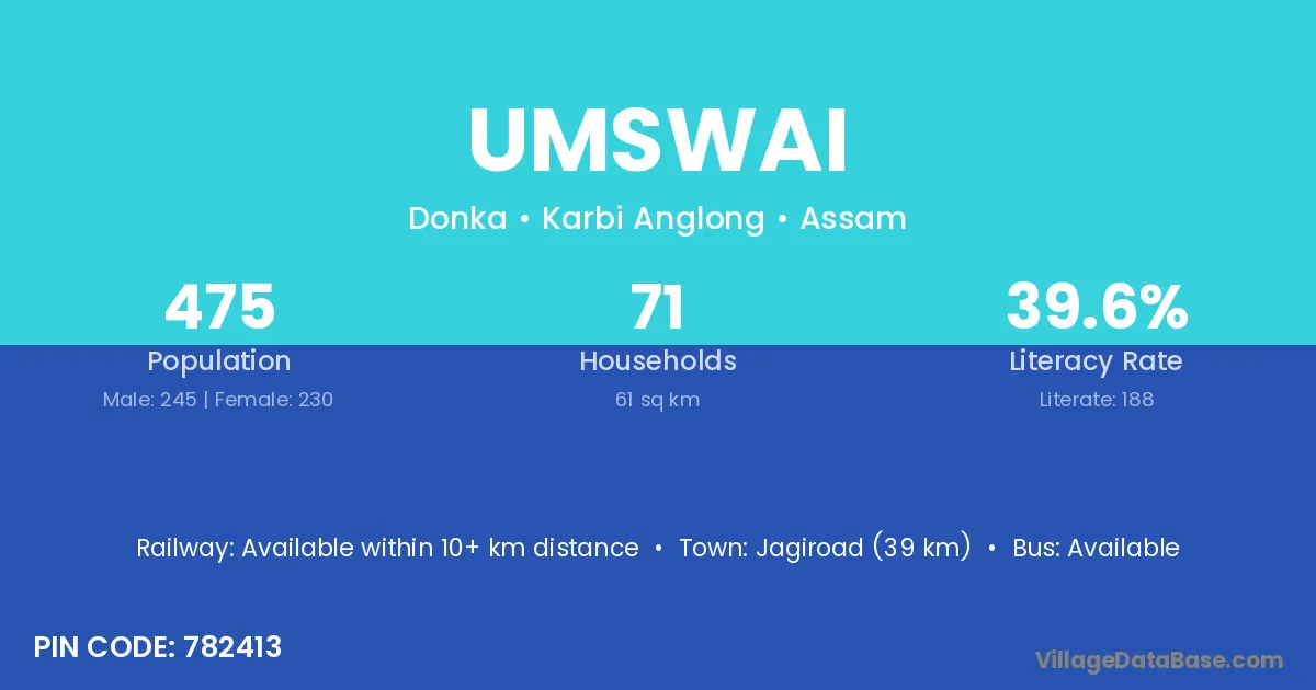 Jagiroad (39 km) is the nearest town to Umswai village for major economic activities and is located approximately 39 km away.