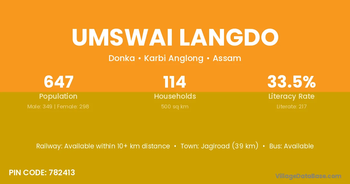 Jagiroad (39 km) is the nearest town to Umswai Langdo village for major economic activities and is located approximately 39 km away.