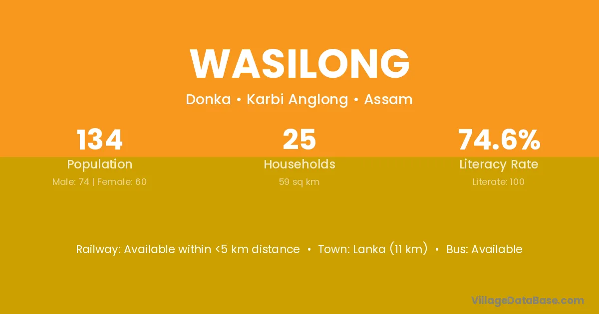 Lanka (11 km) is the nearest town to Wasilong village for major economic activities and is located approximately 11 km away.