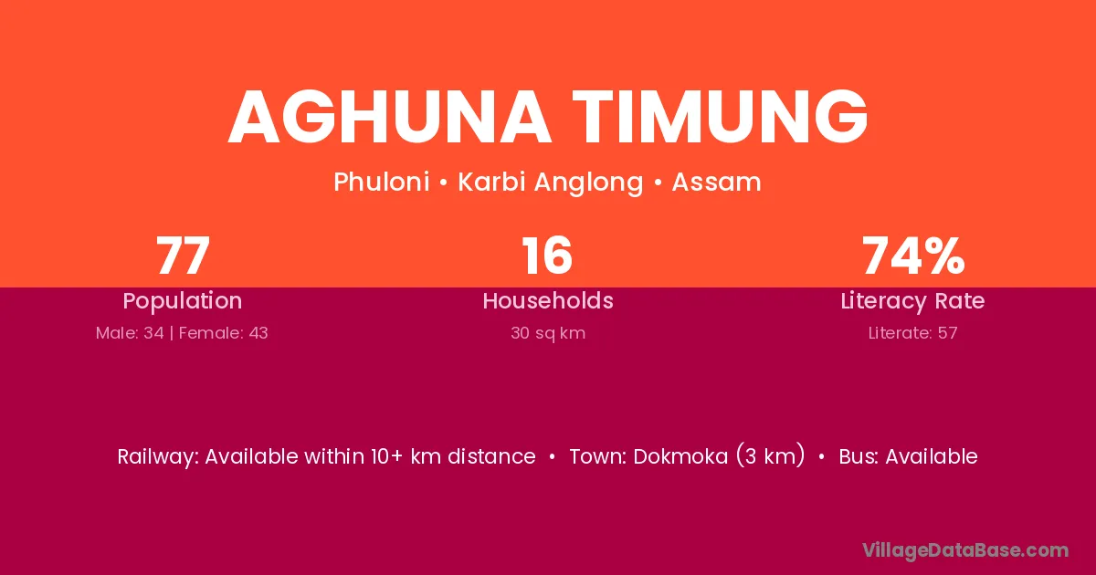 Aghuna Timung village has a total population of 77 people, of which 34 are males and 43 are females.