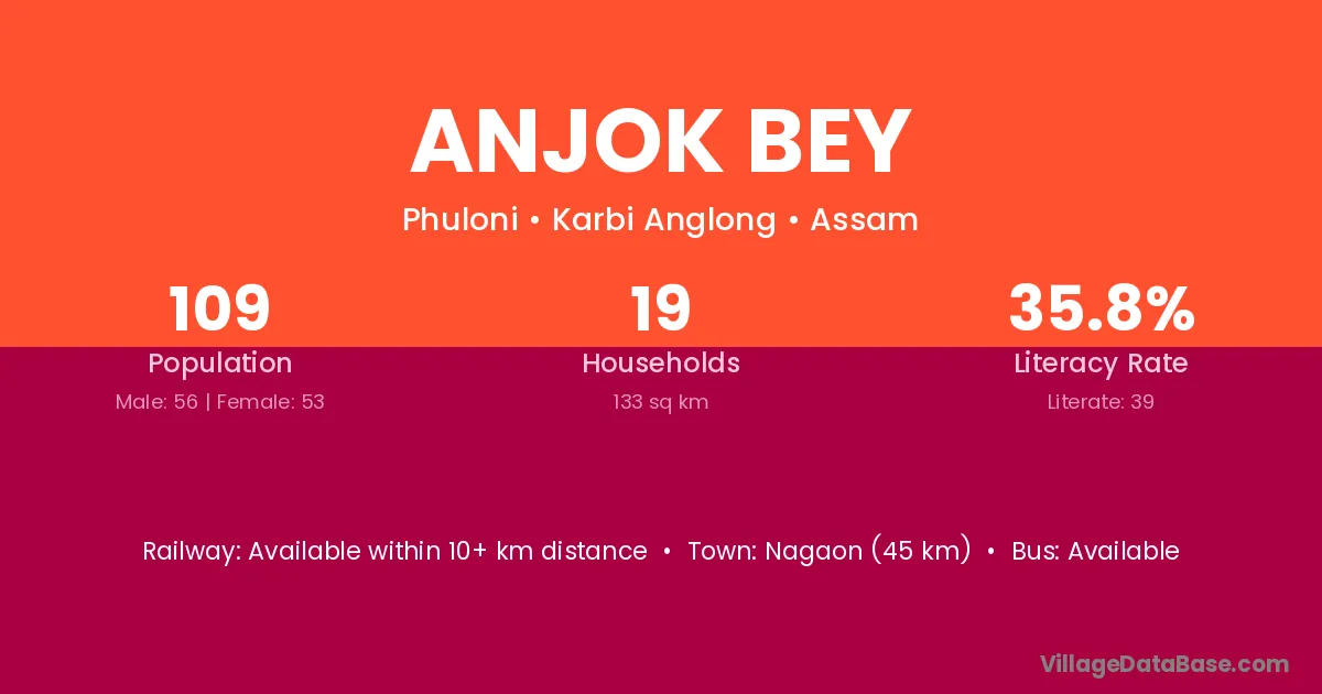 Nagaon (45 km) is the nearest town to Anjok Bey village for major economic activities and is located approximately 45 km away.