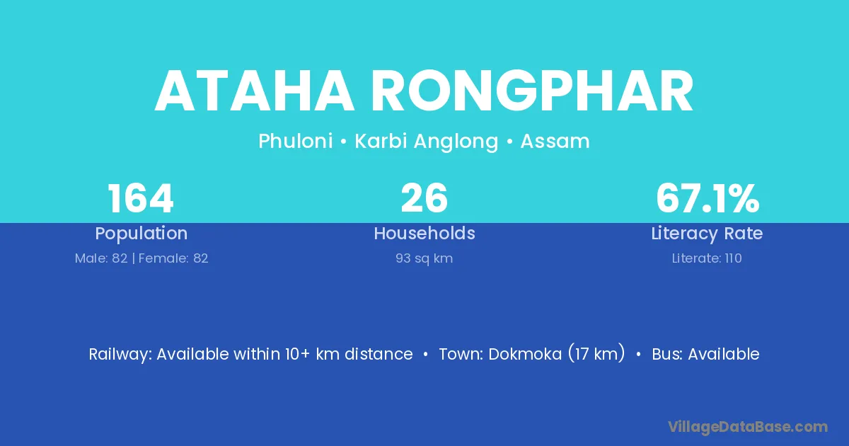 Dokmoka (17 km) is the nearest town to Ataha Rongphar village for major economic activities and is located approximately 17 km away.